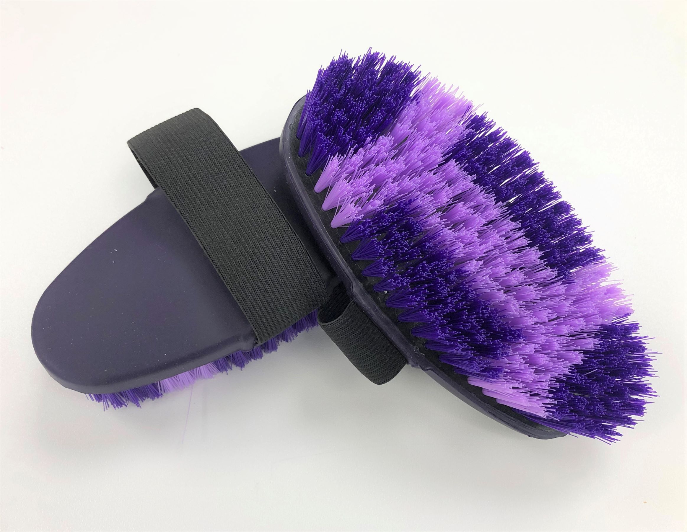 Rubberised back that's easy to grip, elastic hand strap too. Soft bristles for summer coats and sensitive ponies